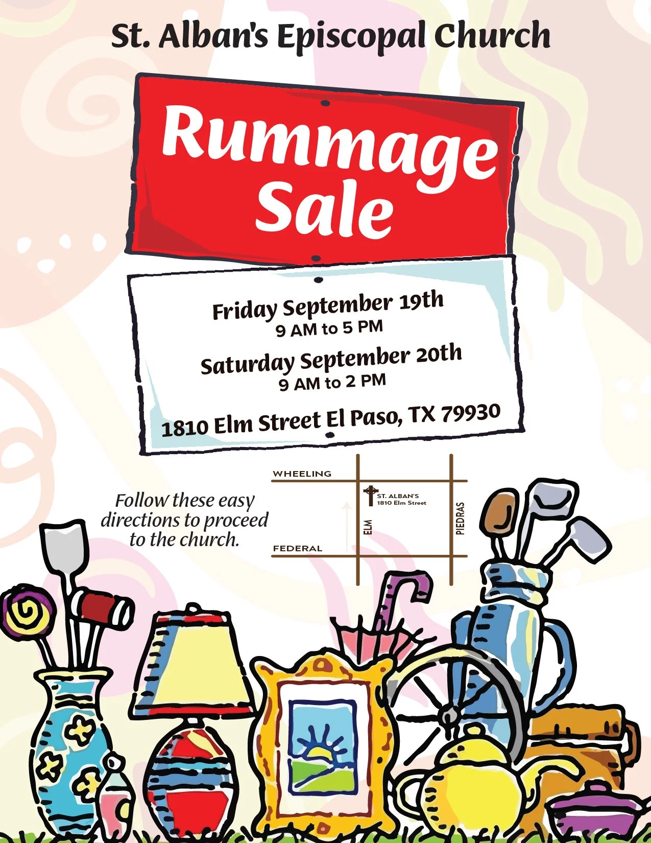 Back to All Events Rummage Sale 20th Saturday, September 20, 2025 9:00 AM 2:00 PM St. Alban's Episcopal Church 1810 Elm Street El Paso, TX, 79930 United States (map) Google Calendar ICS